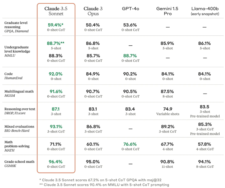 벤치마크 8개 중 7개, 비전 벤치마크 5개 중 4개 분야에서 'GPT-4o'나 '제미나이 1.5 프로', '라마 3 400B' 등 첨단 모델을 능가했습니다. 대학원 수준의 추론 능력(GPQA)은 59.4%로 GPT-4o(53.6%)를 크게 앞섰고, 코딩 능력(HumanEval) 역시 92.0%로 GPT-4o(90.2%) 대비 1.8% 포인트 높았습니다. 또한 클로드 3.5 소네트는 중간 크기의 모델이지만, 전 세대 최고 모델인 클로드 3 오퍼스의 성능을 모두 앞질렀습니다.