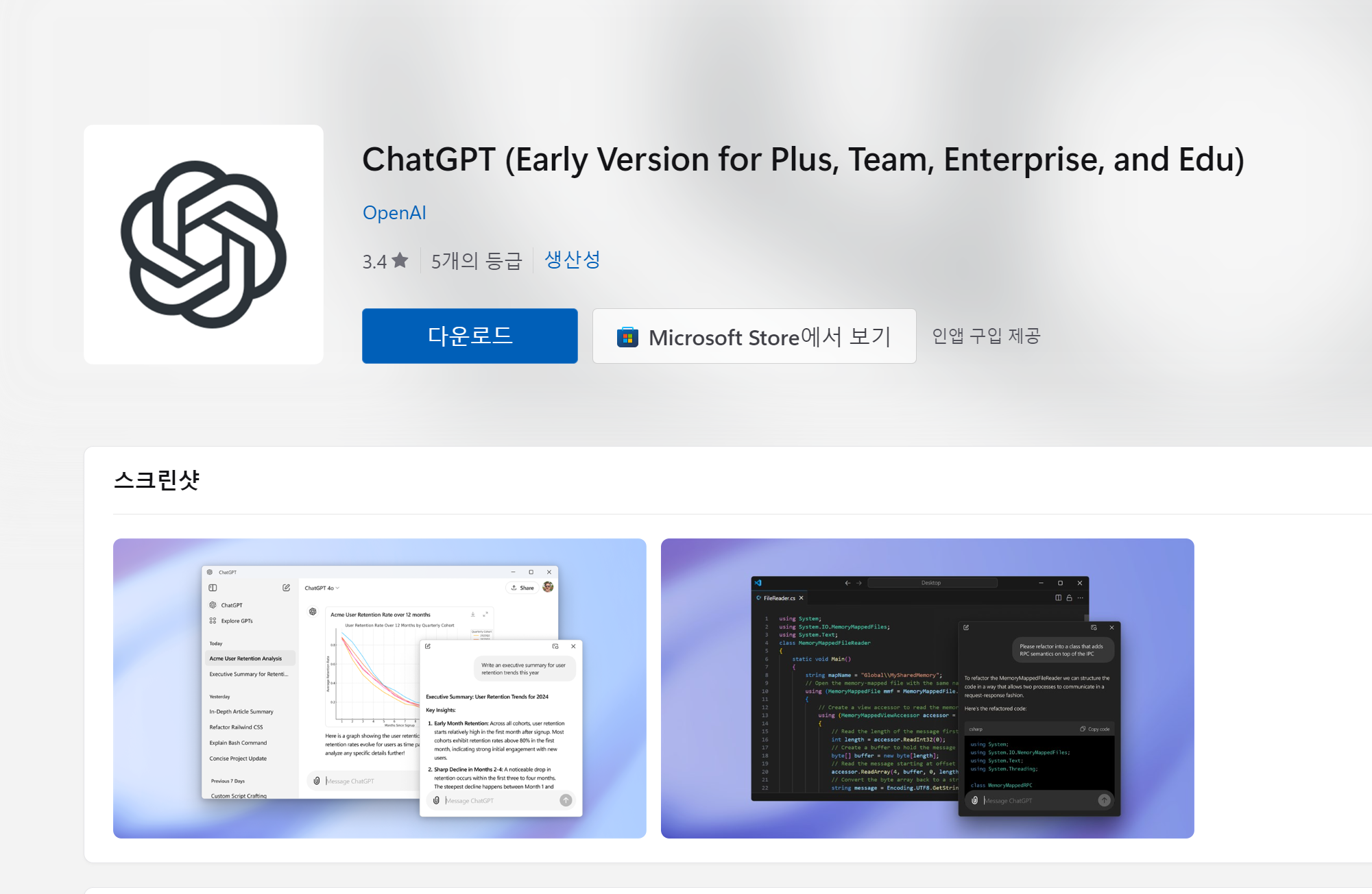 지금 마이크로소프트 스토어에서 챗GPT 윈도우 앱을 다운로드하여 한층 업그레이드된 인공지능 서비스를 경험해 보세요!